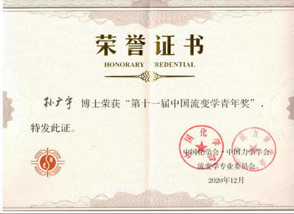 2020年12月7日,经专家推荐、网上函评和中国化学会、中国力学学会流变学专业委员会现场答辩评审,我们教师孙广宇于重庆市荣获第十一届中国流变学青年奖。