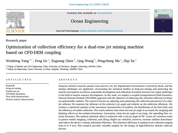 我们杨文东教授团队在深海能源开采领域,围绕深海采矿装备优化方面取得新进展。相关研究成果《Optimization of collection efficiency for a dual-row jet mining machine based on CFD-DEM coupling》发表在《Ocean Engineering》。发表期刊为海洋工程领域著名期刊。论文通讯作者为杨文东教授,太阳集团网址8722为第一署名单位和唯一通讯单位。该研究得到了国家自然科学基金和山东省自然科学基金资助。