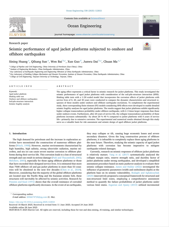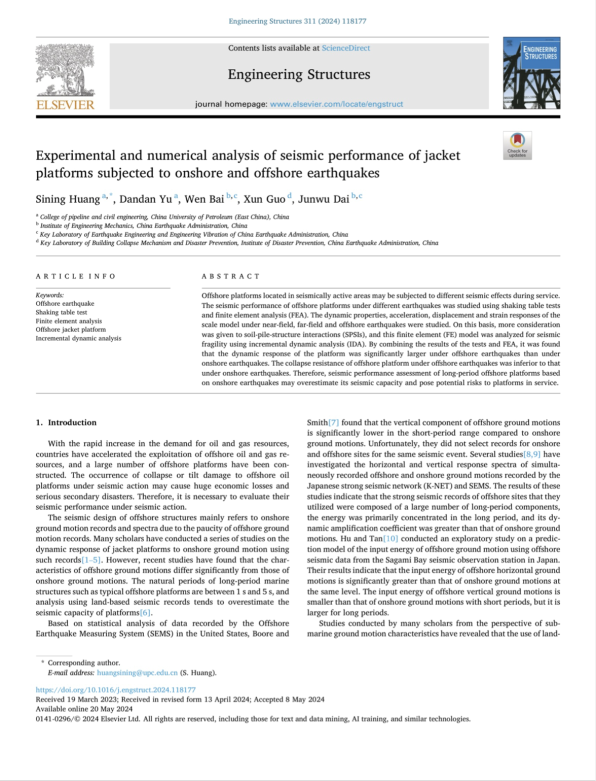 近日,我们黄思凝副教授团队在导管架平台抗震性能研究和老化导管架平台的抗震性能研究方面取得新进展,相关研究成果《Experimental and numerical analysis of seismic performance of jacket platforms subjected to onshore and offshore earthquakes》和《Seismic performance of aged jacket platforms subjected to onshore and offshore earthquakes》分别发表在《Engineering Structures》和《Ocean engineering》。《Engineering Structures》是土木工程领域国际顶级期刊(SCI一区top),《Ocean engineering》是海洋工程领域国际顶级期刊(SCI二区top)。论文第一作者为黄思凝老师,太阳集团网址8722为第一署名单位。该研究得到了国家自然科学基金面上项目:基于全结构全要素的结构地震致灾机理研究和国家重点研发计划项目的资助。