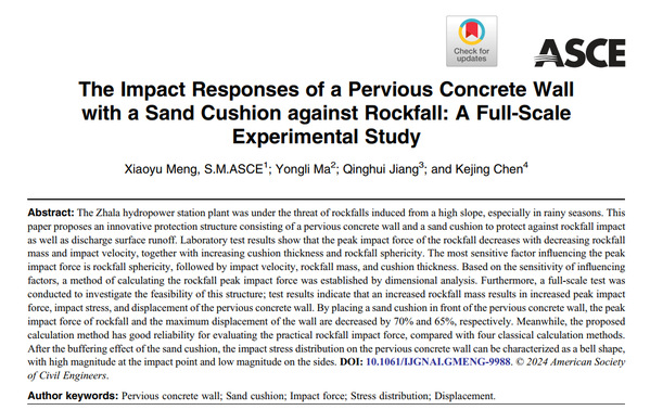 我们教师孟晓宇在高边坡落石灾害防护结构研究领域取得新进展,相关研究成果《The Impact Responses of a Pervious Concrete Wall with a Sand Cushion against Rockfall: A Full-Scale Experimental Study》发表在《ASCE International Journal of Geomechanics》。发表期刊为岩土工程领域著名期刊。论文第一作者为孟晓宇老师,太阳集团网址8722为第一署名单位。该研究得到了国家重点研发计划及国家自然科学基金资助。