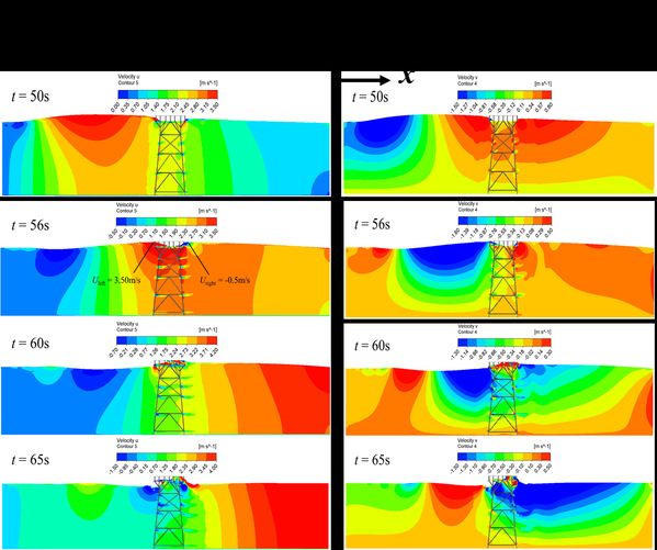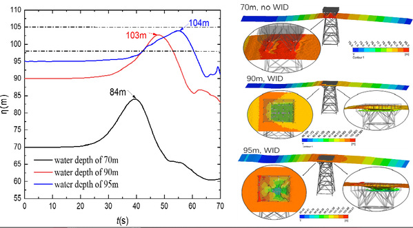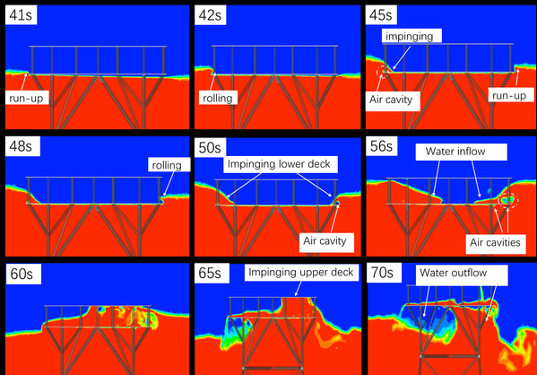 结果分析了海啸类孤立波与导管架平台的耦合特性,揭示了孤立波与导管架平台相互作用,致使孤立波发生爬升、衍射、反射等水动力现象;当波浪的相对波高λ=H/D数值较大时,形成了卷破-溃坝(PDB)混合型甲板上浪WID现象。结果表明上述水动力现象显著影响作用在导管架平台上的波浪力的分布。进一步,通过快速傅里叶变换(FFT)进行频域分析,结果表明,当导管架平台受到海啸波作用时,其在水平方向上比在垂直方向上更容易产生高频共振。此外,波浪非线性的影响对平台结构的响应(包括位移、von-Mises应力和层间位移比(IDR))起着重要作用,这将影响平台在面对海啸类波浪时的运行安全。本研究为评估海啸等极端灾害下平台的抗灾能力提供了指导。