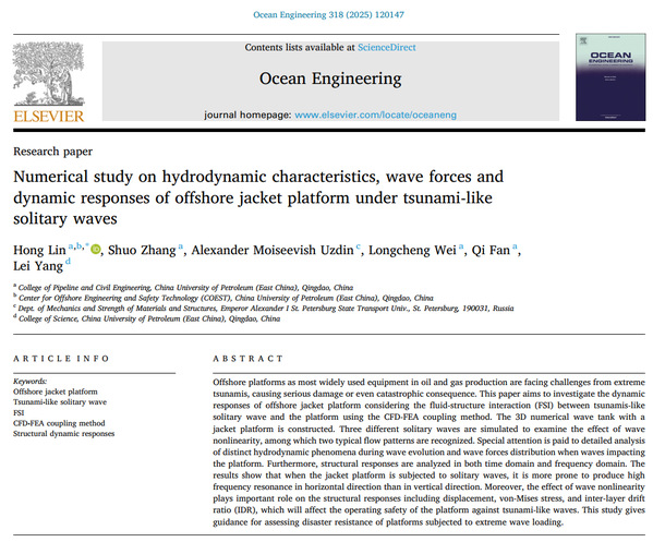 近日,我们林红副教授团队在海啸类孤立波致海洋平台灾变研究方面取得新进展,相关研究成果《Numerical study on hydrodynamic characteristics, wave forces and dynamic responses of offshore jacket platform under tsunami-like solitary waves》发表在《Ocean Engineering》。《Ocean Engineering》是海洋领域的国际顶级期刊(SCI二区TOP,最新影响因子为5.5)。论文第一及通讯作者为林红副教授,太阳集团网址8722为第一署名单位和唯一通讯单位。该研究得到国家自然科学基金面上项目及中-俄国际合作与交流项目、青岛市自然科学基金项目、中央高校基本科研业务费项目的联合资助。