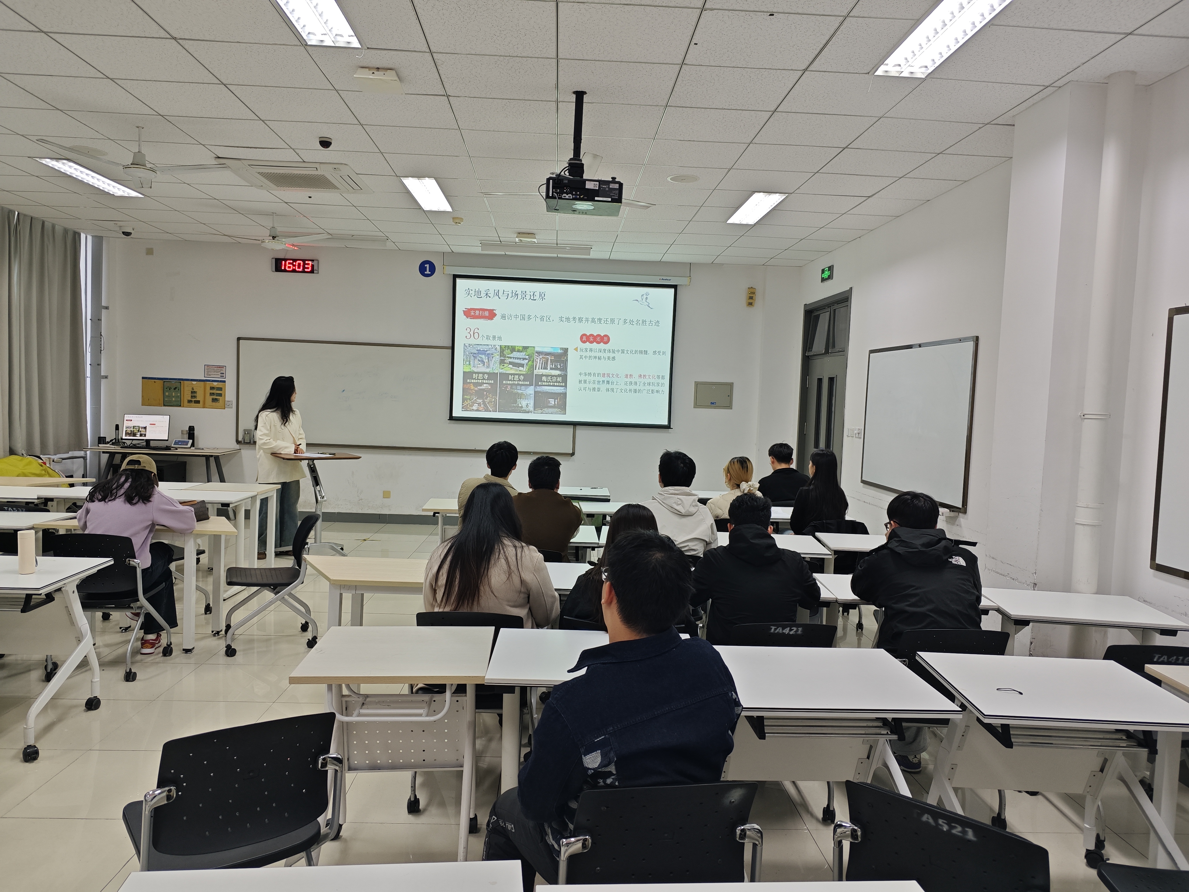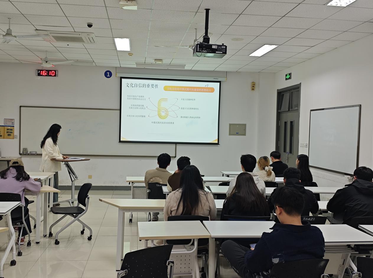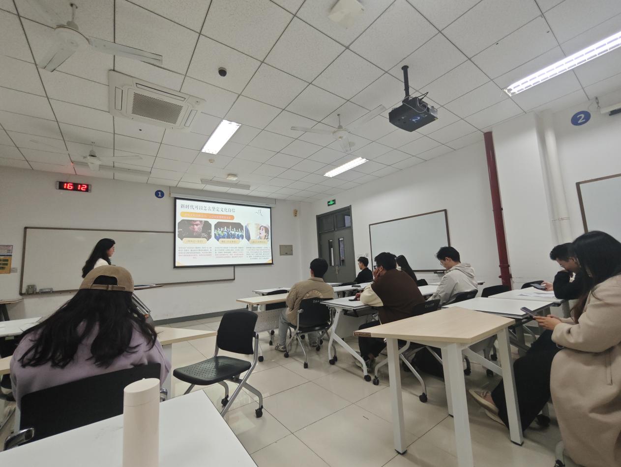 随后,活动进入主题讲解环节。主讲人以PPT为依托,聚焦《黑神话・悟空》中的文化自信,详细介绍游戏如何以《西游记》为蓝本,通过现代叙事与技术还原经典,又以36个实地采风取景地还原中华建筑文化、道佛文化,让海外玩家即便语言不通也能感受东方文化力量。主讲人还阐释了文化自信的重要性,结合“四个自信”理论框架,引用党的二十大相关论述,说明文化自信是中国式现代化的思想动力。