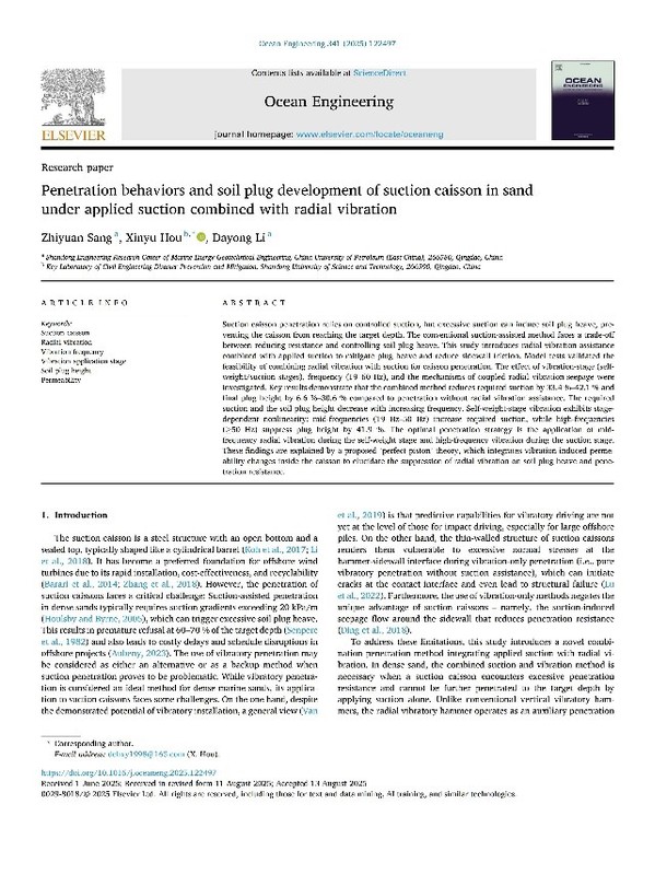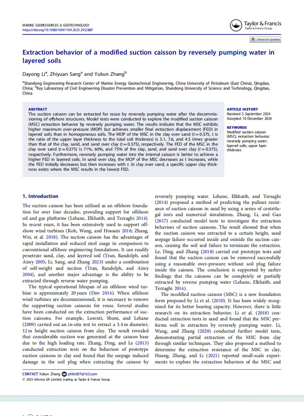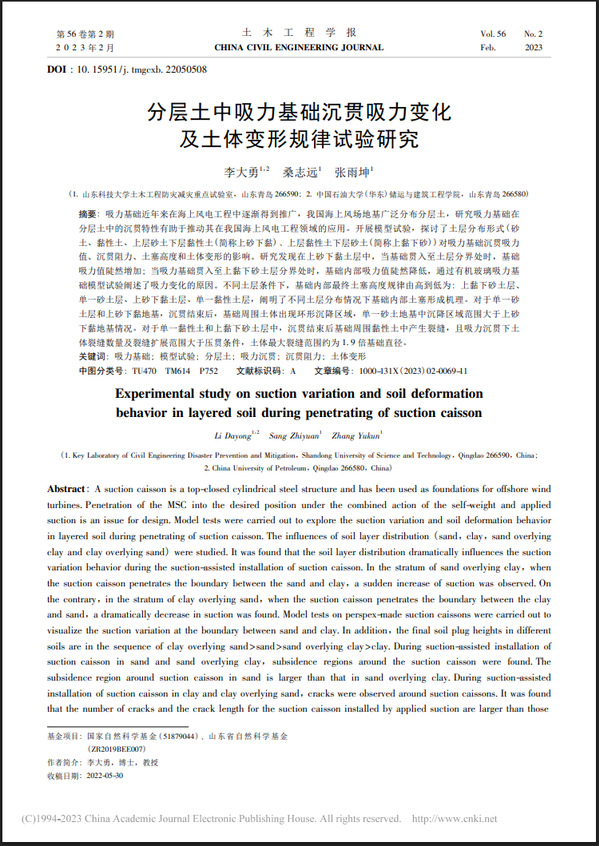 近日,我们李大勇教授团队在海上风电吸力基础锚固安装领域取得新进展,相关研究成果《分层土中吸力基础沉贯吸力变化及土体变形规律试验研究》,《Extraction behavior of a modified suction caisson by reversely pumping water in layered soils》和《Penetration behaviors and soil plug development of suction caisson in sand under applied suction combined with radial vibration》分别发表在《土木工程学报》,《Marine Georesources & Geotechnology》和《Ocean Engineering》。《土木工程学报》是土木工程领域国内顶级EI期刊(卓越期刊),《Marine Georesources & Geotechnology》是海洋工程领域国际著名期刊,《Ocean engineering》是海洋工程领域国际顶级期刊(SCI二区top)。论文第一作者分别为李大勇老师以及博士生桑志远。太阳集团网址8722为第一,二署名单位。该研究得到了国家自然科学基金面上项目的资助。