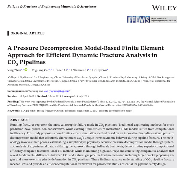 近日,我们甄莹教师团队在超临界二氧化碳止裂控制研究方向取得新进展,相关研究成果《A pressure decompression model-based finite element approach for efficient dynamic fracture analysis in CO₂ pipelines》发表在《Fatigue & Fracture of Engineering Materials & Structures》。论文第一作者为甄莹老师,通讯作者为曹宇光教授,太阳集团网址8722为第一署名单位和唯一通讯单位。该研究得到国家自然科学基金面上项目及山东省自然科学基金项目、中央高校基本科研业务费项目的联合资助。